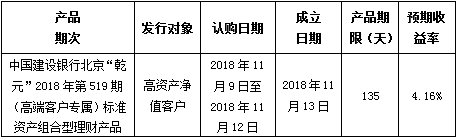 中国建设银行北京市分行定于2018年11月9日发行理财产品,现将相关发行情况公告如下:
