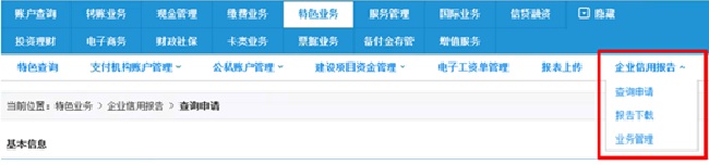 企业信用报告是征信机构出具的记录企业历史信用信息的文件,是企业的“信用名片”,可以帮助企业的交易伙伴了解企业的经营状况及信用状况,方便企业达成经济金融交易。进入“特色业务”,依次点击“业务管理”、“查询申请”、“报告下载”。
