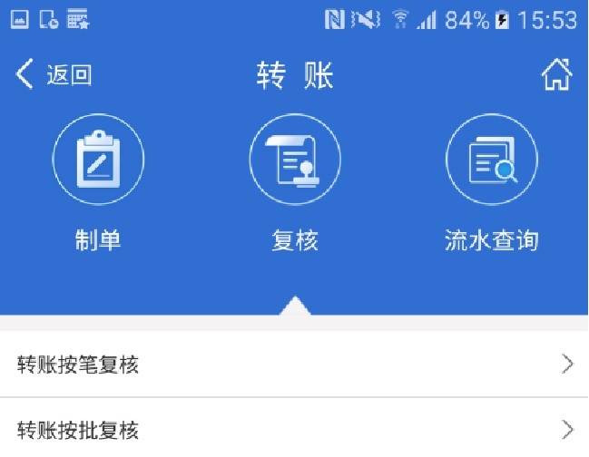(1)复核员通过企业手机银行主页面点击【转账-复核】菜单进入复核界面,点击“转账按笔复核”。
